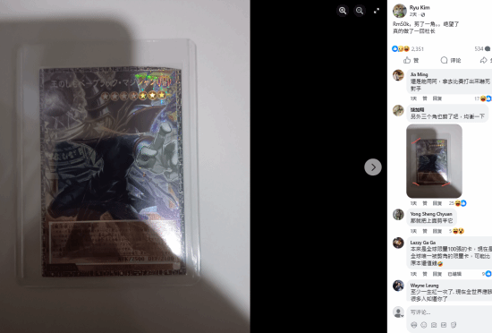 一名马来西亚《游戏王》玩家日前在开卡时发生意外,瞬间损失价值约百万元的收藏卡。3月13日,一段影片在网上流传:该玩家在拆卡包时抽中了带有限量编号的“超框版黑魔导”,市价约600万日元(约合130万元人民币左右的收藏级价值区间),但在开封过程中不慎用剪刀把卡片一角剪坏,原本的高价卡瞬间价值大跌,引发大量网友关注。